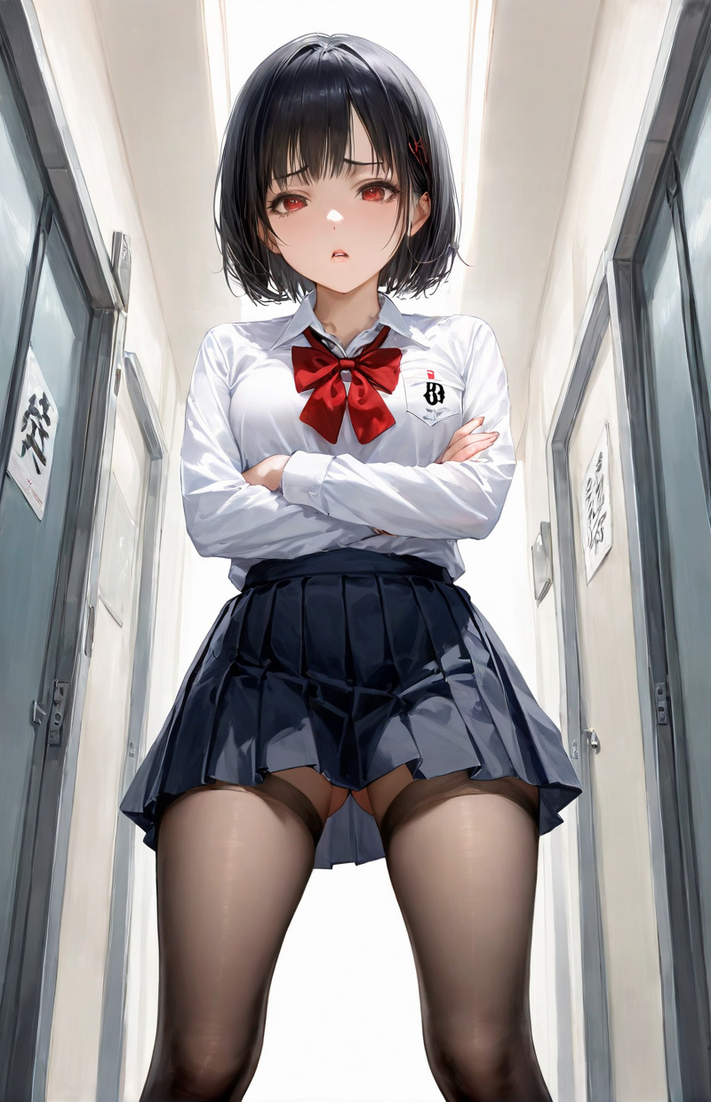 真っ白なブラウス、赤いリボン、そして…ピンと張った黒タイツの脚。