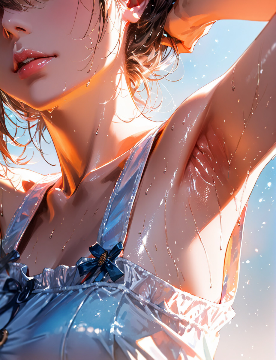 腋汗バンザイスタイル × ノースリーブ&スポブラ女子 腕を上げる。たったそれだけの動作で、世界が一変する。 ノースリーブでも、スポブラでも、腋のラインがふわっと露わになる。そこにじんわり浮かぶ汗――もうそれだけで、視線が止まる。いや、止められない。 布が肌にぴたりと貼りついて、輪郭が浮かび上がる。濡れてる。だけど隠していない。むしろ、その“自然な無防備さ”に心が持っていかれる。 腋ににじむ汗って、ただの体液じゃない。そこには熱があって、湿度があって、生活のにおいすら感じる。触れていな... -